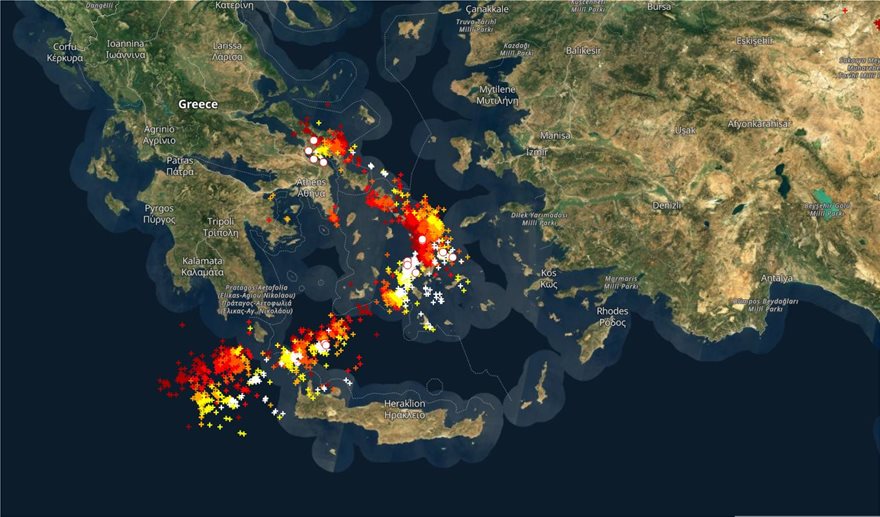 Το μέτωπο των καταιγίδων που δημιουργεί ο κυκλώνας Ιανός στο Ιόνιο, κινήθηκε ανατολικά προς τα Κύθηρα, το Αιγαίο και τις Κυκλάδες, όπου φαίνεται να συναντά τις καταιγίδες που πέρασαν από Θεσσαλία και εκδηλώνονται πλέον στην Εύβοια.