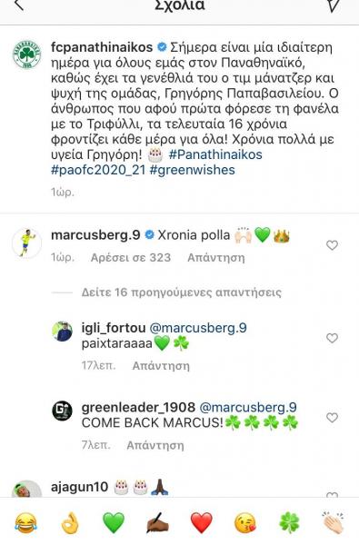 Μπορεί ο Μάρκους Μπεργκ να έχει φύγει τρία χρόνια από τον Παναθηναϊκό αλλά οι φίλοι της ομάδας τον αναζητούν ακόμα. Η δημοφιλία του παίκτη φάνηκε από τις αντιδράσεις που είχε το σχόλιό του κάτω από το ποστ της ΠΑΕ, με το οποίο ευχήθηκε χρόνια πολλά στον Γρηγόρη Παπαβασιλείου. Οι φίλοι του Παναθηναϊκού του ζήτησαν να επιστρέψει στην ομάδα.