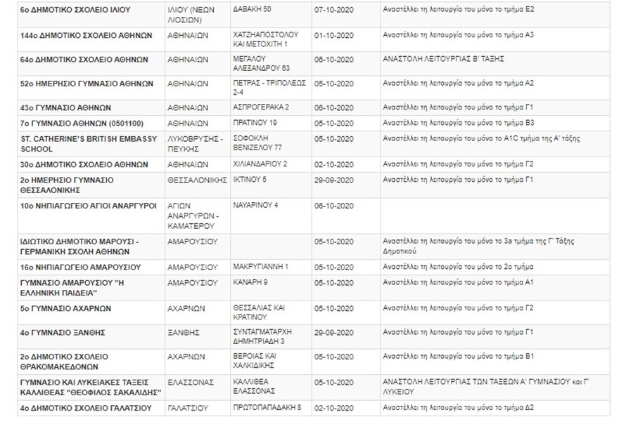 Σύμφωνα με την επίσημη σελίδα του υπουργείου Παιδείας που αναρτά τις σχετικές πληροφορίες για την αναστολή λειτουργίας δομών εκπαίδευσης, τα περισσότερα σχολεία στα οποία έχουν εμφανιστεί κρούσματα βρίσκονται στην Αττική.