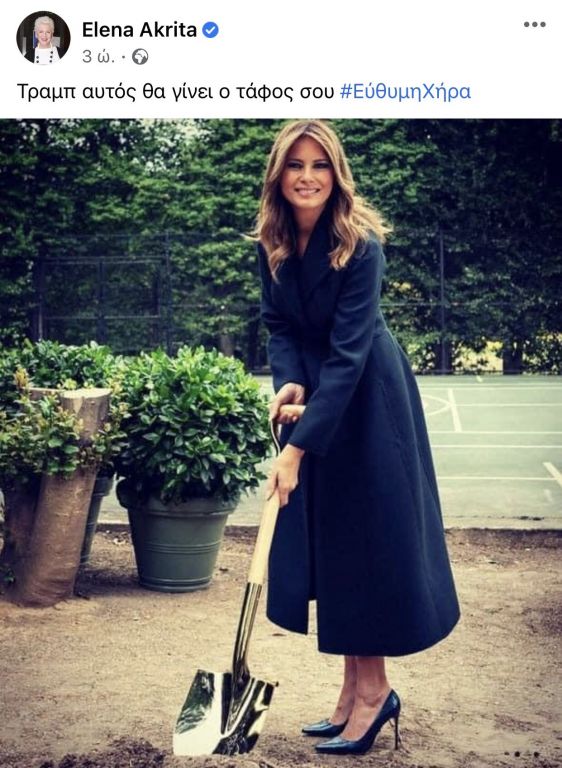 Η Έλενα Ακρίτα επέλεξε να μη κάνει κάποιο μεγάλο σχόλιο. Αρκέστηκε σε μια φωτογραφία και μια απλή λεζάντα, όλο νόημα. Συγκεκριμένα στην εικόνα εμφανίζεται η Μελάνια Τράμπ με ένα φτυάρι να είναι έτοιμη να σκάψει έναν λάκκο. Το μήνυμα της φωτογραφίας ήταν “Τραμπ αυτός θα γίνει ο τάφος σου #ΕύθυμηΧήρα”. Με αυτό τον τρόπο καυτηρίασε τα όσα έχουν ακουστεί κατά καιρούς για τις σχέσεις του ζευγαριού.