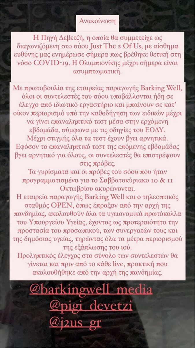 Όλοι οι συντελεστές του συγκεκριμένου show υποβάλλονται ήδη σε έλεγχο από ιδιωτικό εργαστήριο και μπαίνουν σε κατ’ οίκον περιορισμό υπό την καθοδήγηση των ειδικών μέχρι να γίνει επαναληπτικό τεστ μέσα στην ερχόμενη εβδομάδα, σύμφωνα με τις οδηγίες του ΕΟΔΥ. Μέχρι στιγμής όλα τα τεστ έχουν βγει αρνητικά.