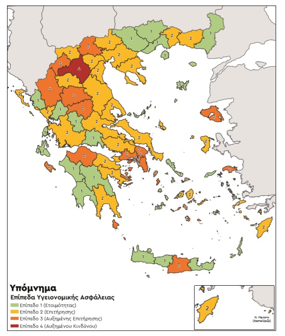 Μέχρι στιγμής, με βάση τον Χάρτη Υγειονομικής Ασφάλειας και Προστασίας, οι Περιφερειακές Ενότητες έχουν κατανεμηθεί ως εξής: