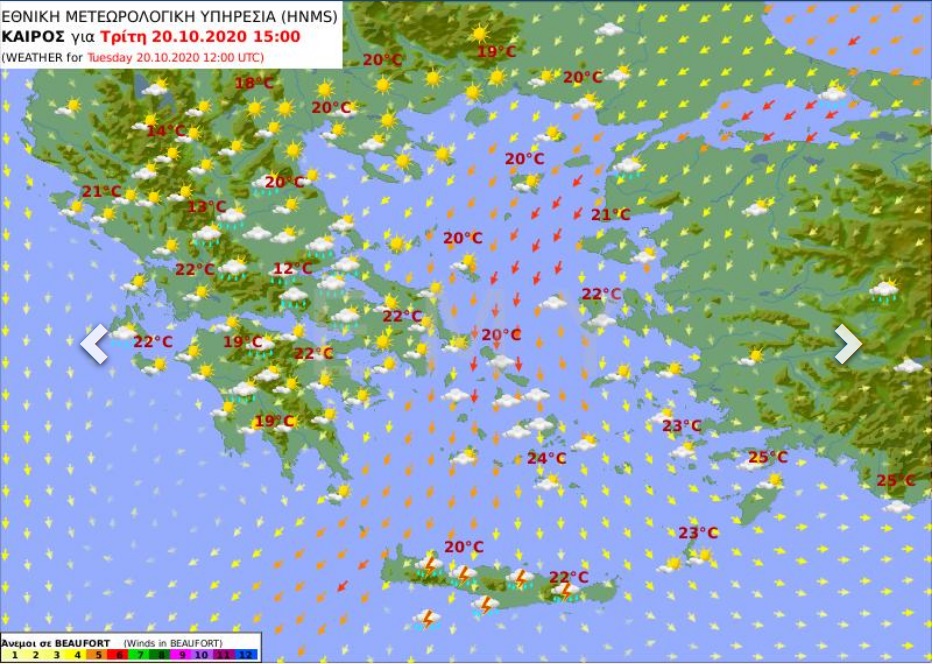 Τα γενικά χαρακτηριστικά και οι προειδοποιήσεις σχετικά με την πρόγνωση για τον καιρό για σήμερα Τρίτη 20 Οκτωβρίου 2020 αναφέρουν βροχές και καταιγίδες κατά τόπους ισχυρές που πιθανώς να συνοδεύονται από χαλαζοπτώσεις από νωρίς το πρωί στην Κρήτη, από τη νύχτα στην Εύβοια και πιθανώς πρόσκαιρα στα νότια τμήματα της Πελοποννήσου. Οι άνεμοι θα πνέουν βόρειοι βορειοανατολικοί τοπικά στο Αιγαίο 6 και βαθμιαία 7 μποφόρ.