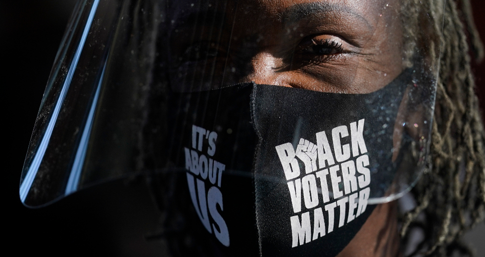 Το κίνημα Black Lives Matter καθόρισε εν πολλοίς την προεκλογική μάχη, ειδικά μετά τη δολοφονία του Τζορτζ Φλόιντ στη Μινεάπολις. Ψηφοφόρος φοράει μάσκα που αναφέρει: «Οι μαύροι ψηφοφόροι μετρούν».
