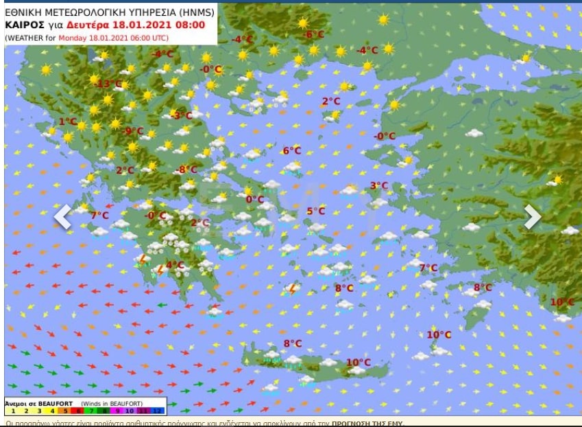 - Καιρός: Νεφώσεις με χιονόνερο ή χιόνι ακόμα και σε πεδινές περιοχές, οι οποίες θα είναι κατά τόπους πυκνές μέχρι αργά το απόγευμα στις ανατολικές περιοχές. Σποραδικές καταιγίδες θα εκδηλωθούν στα νότια θαλάσσια -παραθαλάσσια, κατά τόπους ισχυρές στη νότια Πελοπόννησο μέχρι το μεσημέρι.