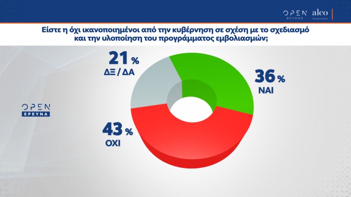 Για το αν είναι ικανοποιημένοι από το σχέδιο των εμβολιασμών το 36% απάντησε «ναι», το 43% «όχι», με το 21% «δεν ξέρω, δεν απαντώ». Όσο για τον εμβολιασμό των κυβερνητικών αξιωματούχων, το 62% απάντησε πως δεν το είδε θετικά σε αντίθεση με το 22%.