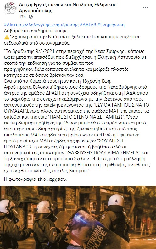 Τα επεισόδια στη Νέα Σμύρνη είναι στο επίκεντρο των ημερών Ωστόσο σάλο έχει προκαλέσει καταγγελία που κάνει το γύρο των Μέσων Κοινωνικής Δικτύωσης και στην οποία αναφέρεται ότι μια 18χρονη κοπέλα ξυλοκοπήθηκε και παρενοχλήθηκε σεξουαλικά από αστυνομικούς, στα επεισόδια των προηγούμενων ημερών στην περιοχή.