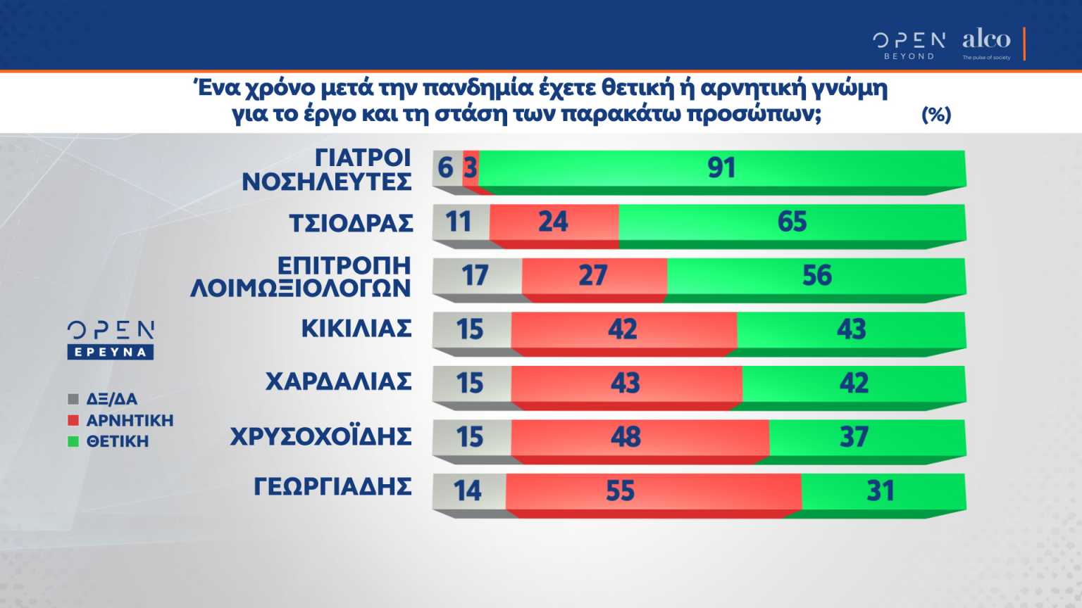 Για το έργο και τη στάση των αρχηγών των δύο μεγαλύτερων κομμάτων στον έναν χρόνο της πανδημίας, το 48% κρίνει θετικά τον Κ. Μητσοτάκη, ενώ ο Αλ. Τσίπρας συγκεντρώνει 30% θετικών γνωμών.Η ικανοποίηση από την κυβέρνηση όσον αφορά στον σχεδιασμό και την υλοποίηση του προγράμματος εμβολιασμού εμφανίζεται αυξημένη, στο 51%, έναντι 38% που δηλώνει μη ικανοποιημένο.