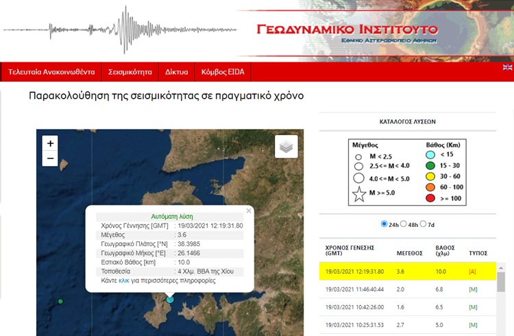 Ο σεισμός που σημειώθηκε το μεσημέρι της Παρασκευής στο νησί ήταν 3,6 Ρίχτερ. Καταγράφηκε 4 χιλιόμετρα βόρεια βορειοανατολικά της Χίου, με το εστιακό βάθος να εντοπίζεται στα 10 χιλιόμετρα. Δείτε παρακάτω πώς κατέγραψε τη δόνηση το Γεωδυναμικό Ινστιτούτο του Εθνικού Αστεροσκοπείου Αθηνών.