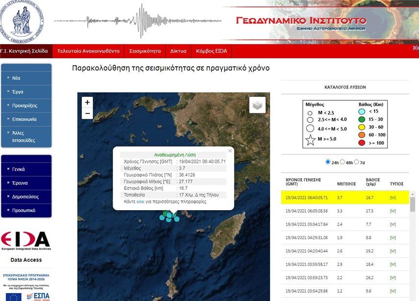 Η σημερινή δόνηση, 3,7 Ρίχτερ, που σημειώθηκε το πρωί, σύμφωνα με το Γεωδυναμικό Ινστιτούτο του Εθνικού Αστεροσκοπείου Αθηνών καταγράφηκε 17 χιλιόμετρα δυτικά του νησιού.