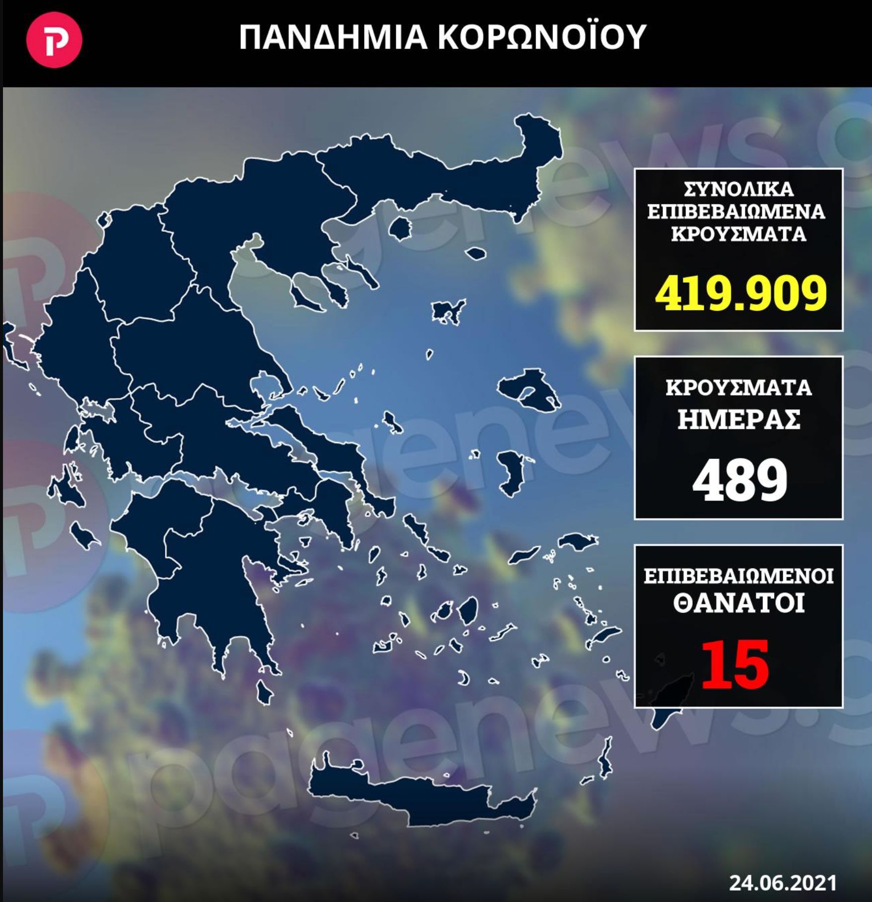 Σύμφωνα με την επίσημη ανακοίνωση από τον Εθνικό Οργανισμό Δημόσιας Υγείας, τα κρούσματα σήμερα 24/06 είναι 489 , εκ των οποίων εντοπίστηκαν κατόπιν ελέγχων στις πύλες εισόδου της χώρας. Υπενθυμίζεται ότι την προηγούμενη Κυριακή τα κρούσματα ανήλθαν στα 580 εκ των οποίων τα 298 εντοπίζονται στην Αττική, ενώ η Θεσσαλονίκη κατέγραψε 68 νέες λοιμώξεις.
