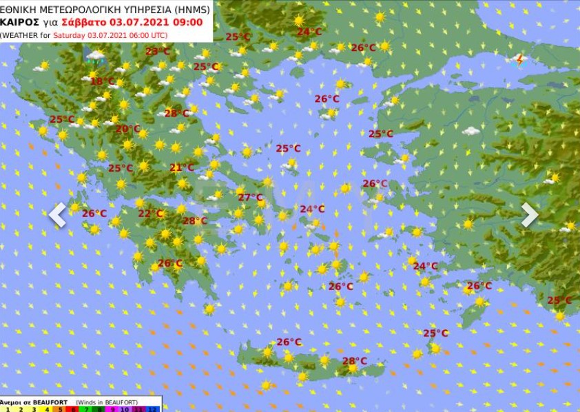 - Θερμοκρασία: Από 22 έως 31 βαθμούς Κελσίου και στα Δωδεκάνησα τοπικά έως 34 βαθμούς Κελσίου.