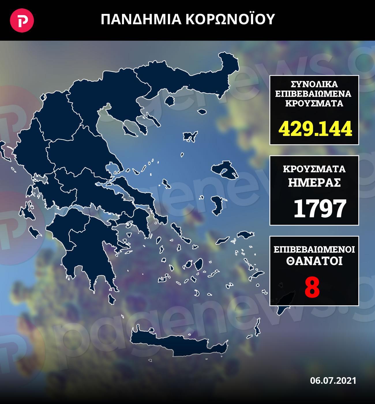 Τα κρούσματα για σήμερα 06/07, σύμφωνα με την ανακοίνωση του ΕΟΔΥ, ανέρχονται στα 1.797 , οι διασωληνωμένοι 168 και οι θάνατοι 8 . Υπενθυμίζουμε πως τα κρούσματα για Κυριακή 04/07 ανήλθαν σε συνολικά 619. Το Σάββατο 03/07, τα κρούσματα είχαν σκαρφαλώσει στα 1.001.