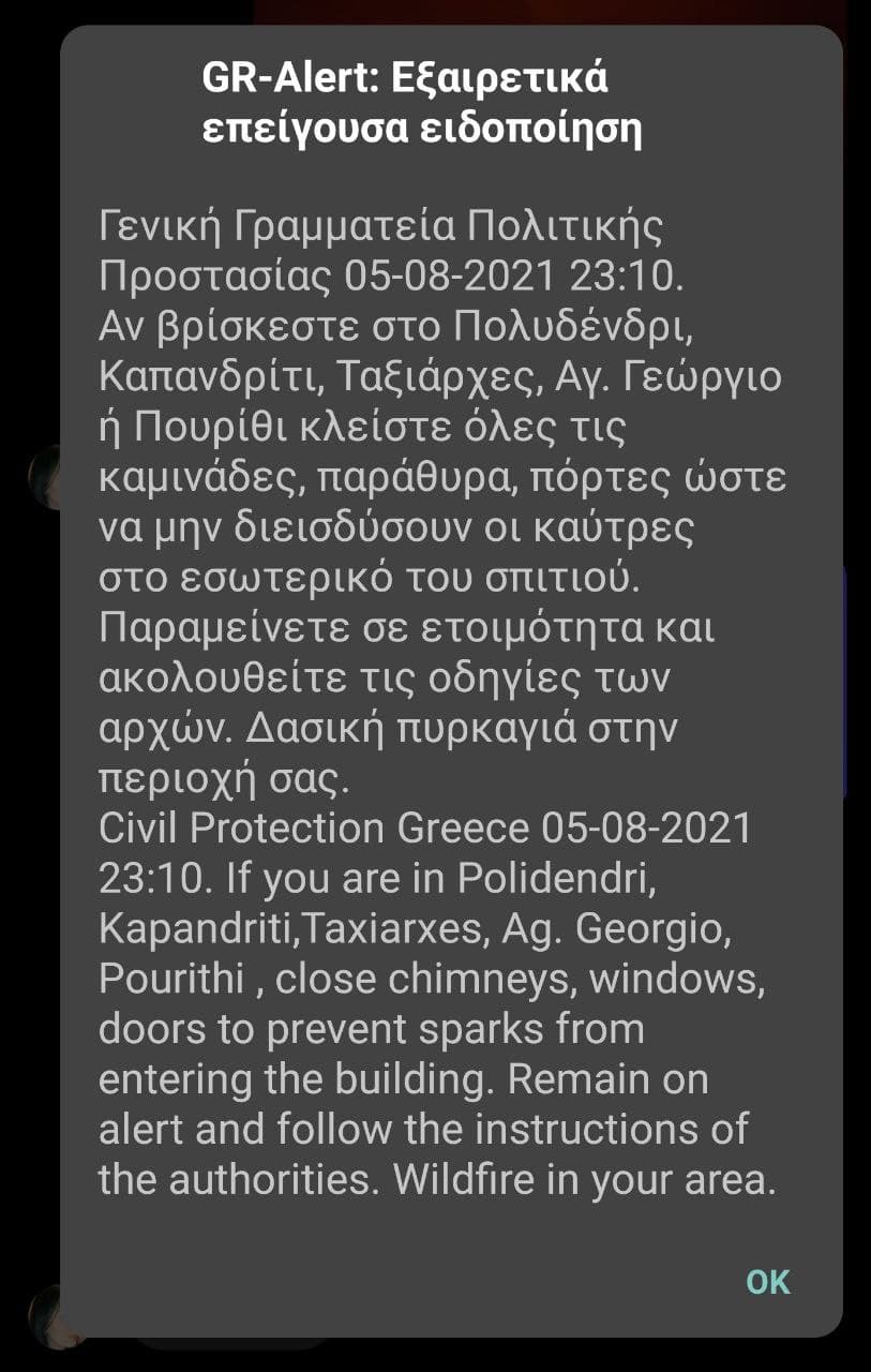 Λίγο μετά τις 11 το βράδυ εστάλη σχετική επείγουσα ειδοποίηση σε όσους βρίσκονται σε Πολυδένδρι, Καπανδρίτι, Ταξιάρχες, Αγ. Γεώργιο ή Πουρίθι να κλείσουν όλες τις καμινάδες, παράθυρα, πόρτες ώστε να μην διειδύσουν οι καύτρες στο εσωτερικό των σπιτιών.