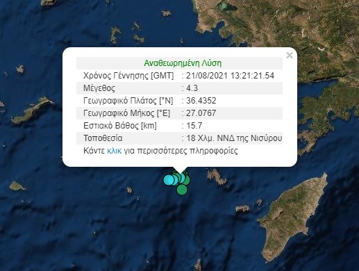 Σύμφωνα με το Γεωδυναμικό Ινστιτούτο, η δόνηση σημειώθηκε 19 χιλιόμετρα νότια-νοτιοδυτικά της Νισύρου.