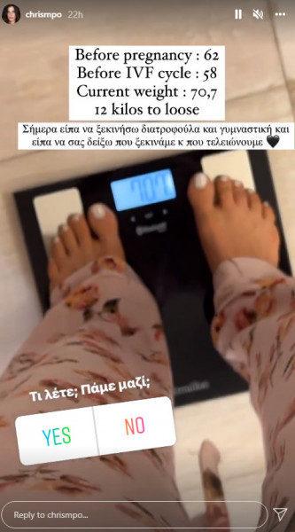 Συγκεκριμένα, η 33χρονη μητέρα το πρωί της Τρίτης 2 Νοεμβρίου ζυγίστηκε και μας έδειξε τα κιλά της. Τώρα λοιπόν ζυγίζει 70,7 και θέλει να χάσει 12 κιλά για να φτάσει τα 58 που ζύγιζε πριν την έναρξη του κύκλου εξωσωματικής γονιμοποίησης.