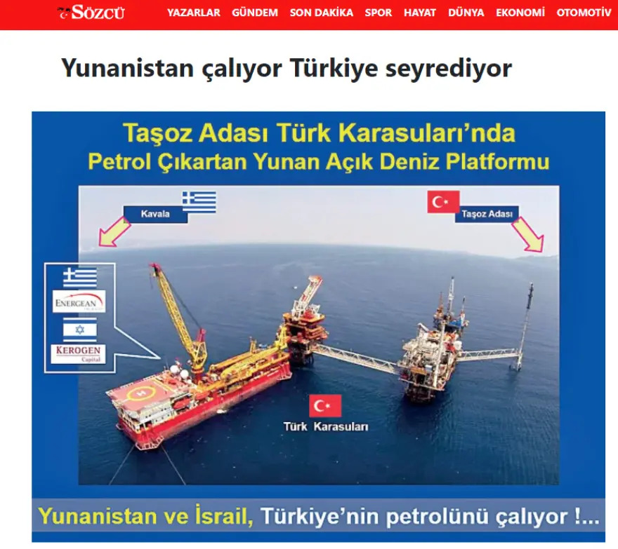 Τα ελληνοτουρκικά προβλήματα συνεχίζονται με την φιλοκυβερνητική Sozcu να κάνει δημοσίευμα σχετικά με τα πετρέλαια της Θάσου. Το δημοσιευμα αναφέρει πως την ώρα που η τιμή του πετρελαίου εκτοξεύεται στα ύψη, η Ελλάδα παράγει ημερησίως 4.000 βαρέλια πετρελαίου από το νησί της Θάσου, τα χωρικά ύδατα του οποίου ανήκουν στην Τουρκία.
