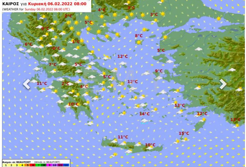 Νεφώσεις αλλά και διαστήματα ηλιοφάνειας αναμένονται την Κυριακή 6 Φεβρουαρίου 2022. Σποραδικές, ασθενείς βροχές στα δυτικά και νότια. Χαμηλές θερμοκρασίες κατά τη διάρκεια της νύχτας. Άνεμοι έως 5 μποφόρ στα πελάγη.
