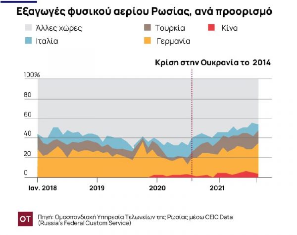 Περισσότερο από το ένα τρίτο των εισαγωγών φυσικού αερίου της ΕΕ εξαρτάται από τη Ρωσία. Μέχρι τον Ιανουάριο, οι ΗΠΑ και η Ευρώπη δεν είχαν σκεφτεί το ενδεχόμενο επιβολής κυρώσεων κατά των ρωσικών εξαγωγών πετρελαίου και φυσικού αερίου, δεδομένης της ανησυχίας τους ότι κάτι θα αύξανε το ήδη υψηλό ενεργειακό κόστος στην Ευρώπη. Ωστόσο, έπειτα από την εισβολή, αυτή την εβδομάδα, η Γερμανία ανακοίνωσε, την Τρίτη, ότι παγώνουν τα σχέδια να ανοίξει τον αγωγό Nord Stream 2, ο οποίος θα αύξανε τις εξαγωγές ρωσικού φυσικού αερίου στη Γερμανία.