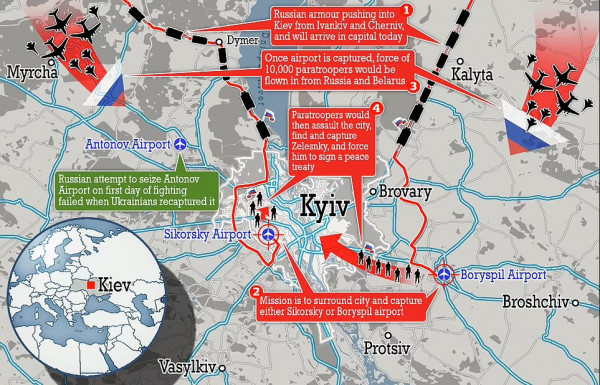 Πάντως το BBC αναφέρει ότι οι ρωσικές δυνάμεις έκαμψαν την αντίσταση στο Obolon (συνοικία που απέχει 9 χιλιόμετρα από το κέντρο), υπερκέρασαν την αντίσταση στο Ivankiv (άλλο προάστιο βορειοδυτικά του Κιέβου) ενώ επελαύνουν και από το Chernihiv (προάστιο στα βορειοανατολικά της πόλης).