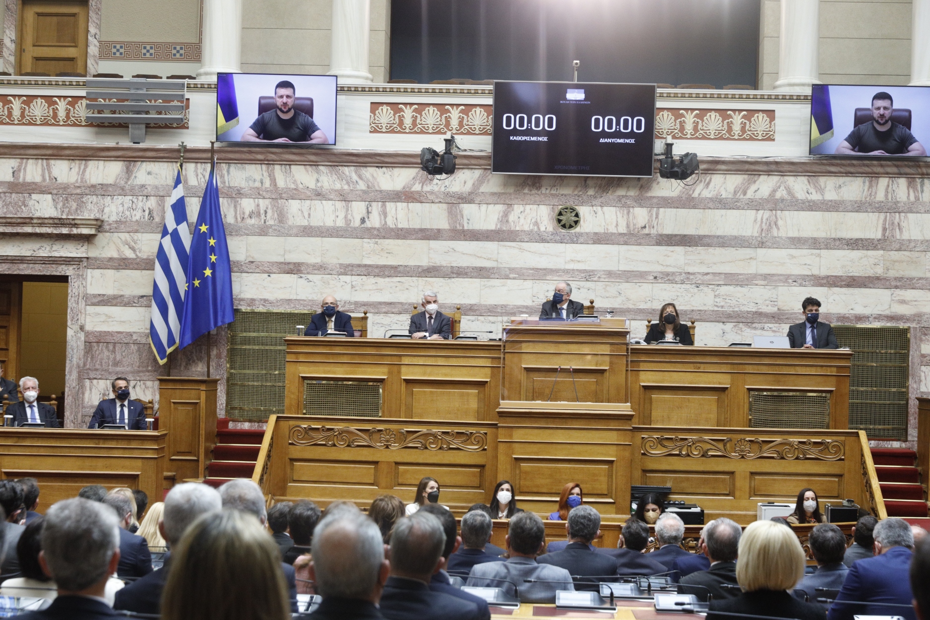 Ολοκληρώθηκε η ομιλία του Ουκρανού προέδρου Βολοντιμίρ Ζελένσκι στο Ελληνικό Κοινοβούλιο στην ειδική, έκτακτη συνεδρίαση της Ολομέλειας. Ο πρόεδρος της Ουκρανίας έκανε έκκληση να δημιουργηθεί νέα Φιλική Εταιρεία στην Ελλάδα για να σωθεί ο Ελληνισμός στην Μαριούπολη και την Οδησσό.