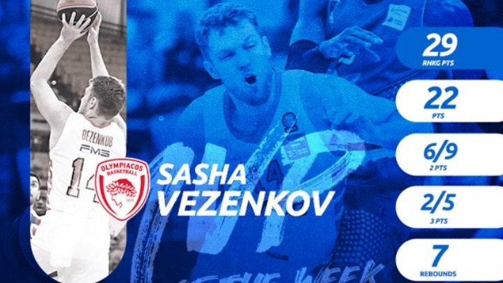 Δύο ημέρες πριν από τον πρώτο αγώνα πλέι οφ του Ολυμπιακού με τη Μονακό στο ΣΕΦ (20/4, 21:00) για τη Euroleague, ο πιο σταθερός παίκτης του φέτος, Σάσα Βεζένκοφ αναδείχτηκε MVP της 22ης αγωνιστικής στην Basket League.