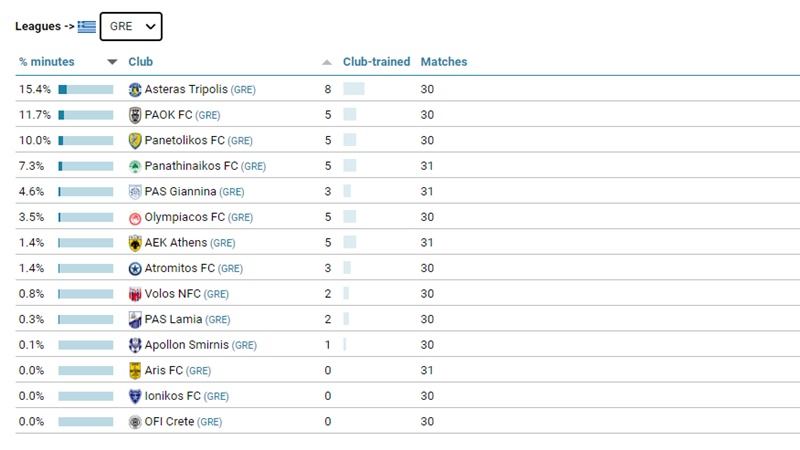 Ιστορικό χαμηλό ανάμεσα σε 40 κορυφαία πρωταθλήματα σε όλο τον κόσμο καταγράφει η ελληνική Super League, σχετικά με τη χρησιμοποίηση παικτών από τα τμήματα υποδομής του συλλόγου.