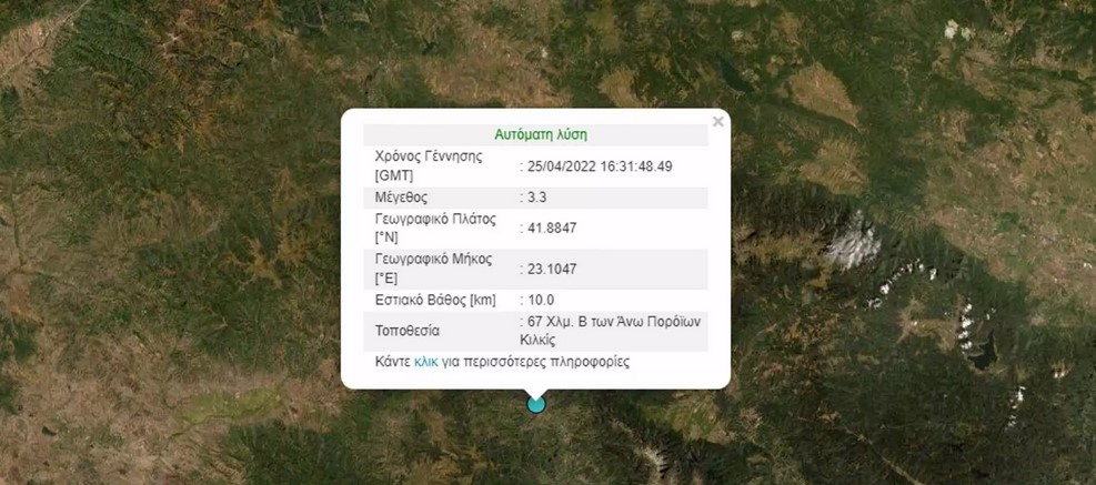 Ο σεισμός στο Κιλκίς είναι μεγέθους 3,3 βαθμών της κλίμακας Ρίχτερ και σημειώθηκε 31′ λεπτά μετά τις 6 το απόγευμα.