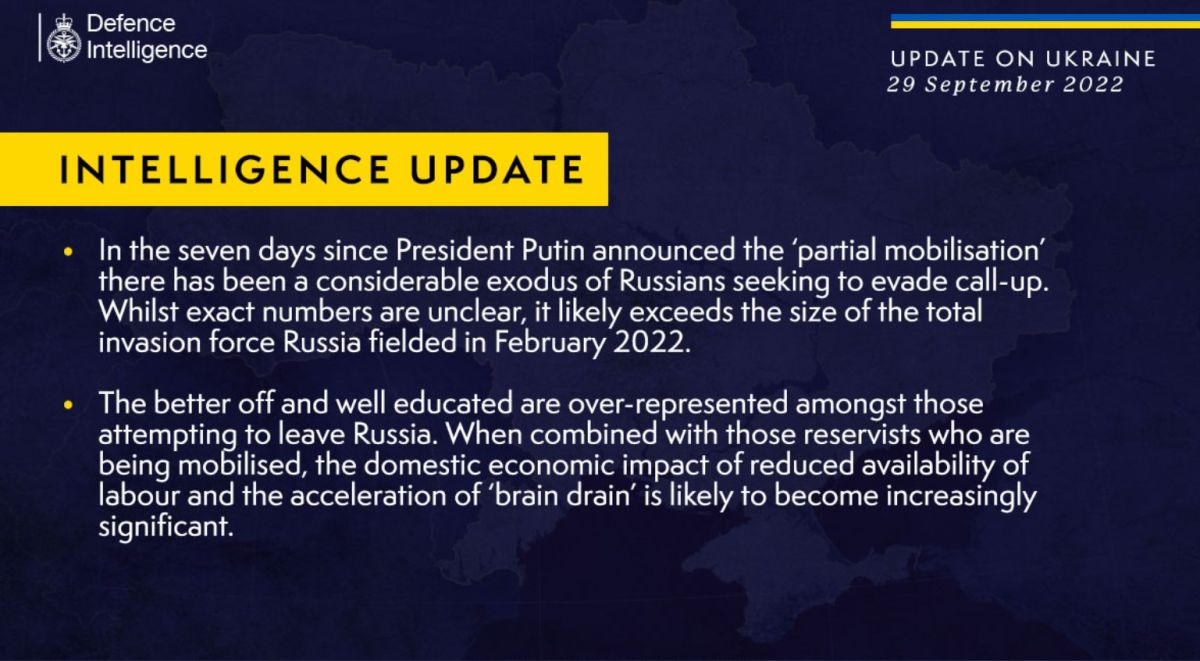 Το συμπέρασμα του υπουργείου: «Μαζί με τους εφέδρους που κινητοποιούνται, ο αντίκτυπος της χαμηλότερης διαθεσιμότητας εργατικού δυναμικού και της επιταχυνόμενης διαρροής εγκεφάλων στη ρωσική οικονομία είναι πιθανό να γίνει όλο και πιο σημαντικός».