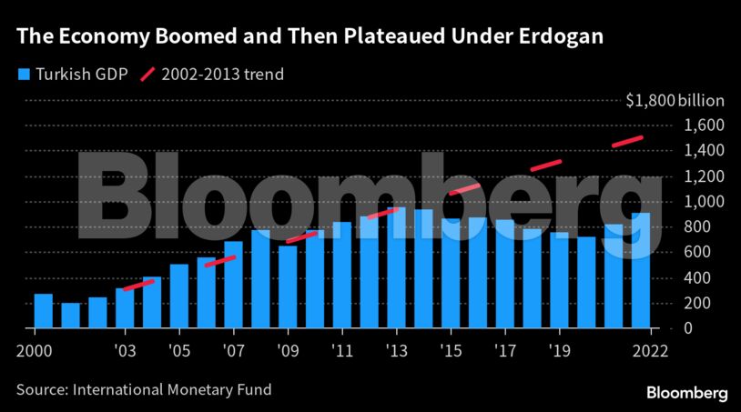 Το μέγεθος της τουρκικής οικονομίας είχε σχεδόν τετραπλασιαστεί κατά τη διάρκεια της πρώτης δεκαετίας διακυβέρνησης του Ερντογάν, πλησιάζοντας τα $960 δισ. το 2013. Από τότε, όμως, έχει λιμνάσει παρά τις προσπάθειες του Τούρκου Προέδρου.