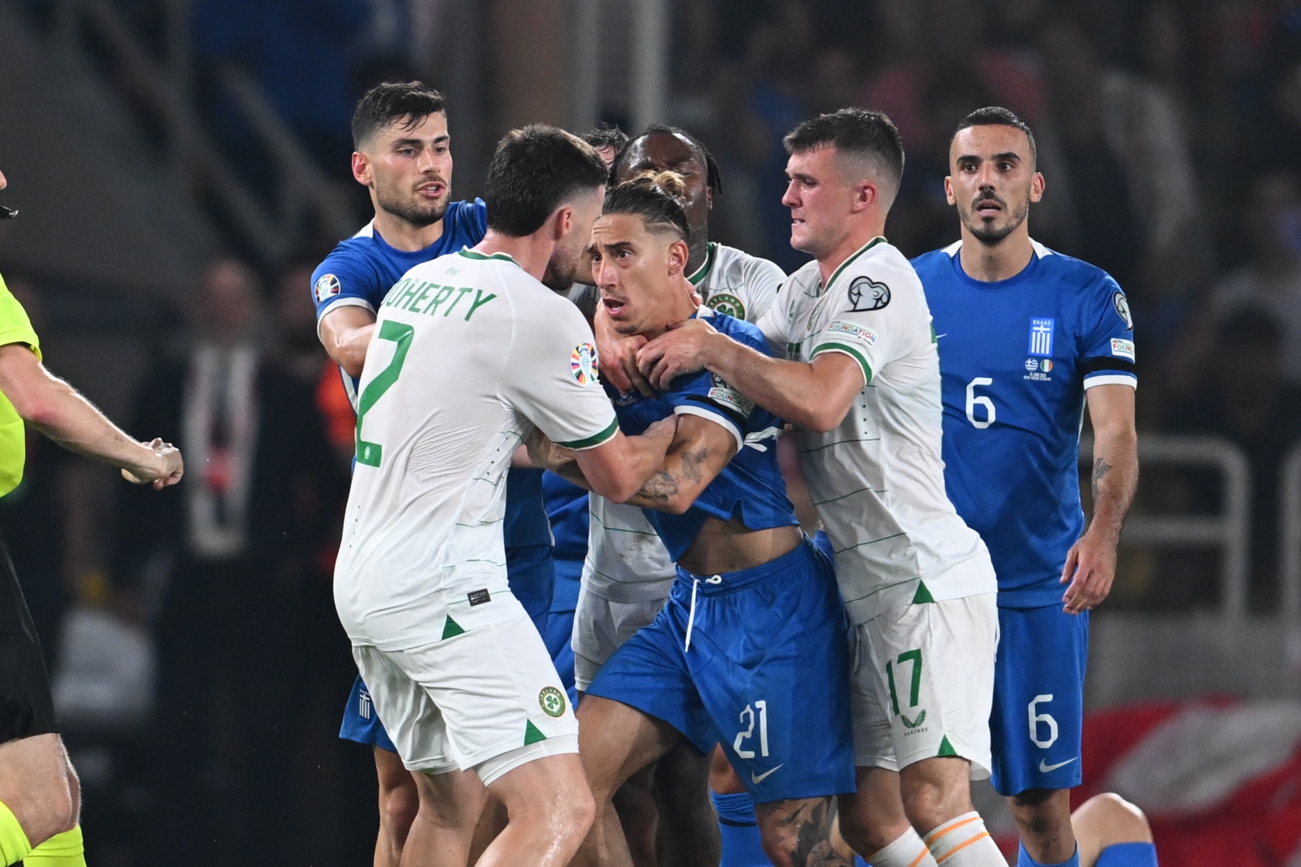 Η Ιρλανδία είχε τον Μπαζούνου γκολκίπερ, τριάδα στην άμυνα με Λένιχαν, Ίγκαν και Ν. Κόλινς, κέντρο με Ο’Ντάουντα, Μολούμπι, Σμόλμποουν, Κάλεν και Ντόχερτι και μπροστά τους Φέργκιουσον και Άινταχ.
