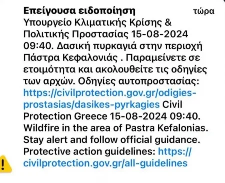 Για τη φωτιά στην Κεφαλονιά εστάλη μήνυμα από το 112 στους κατοίκους, μέσω του οποίου τους ζητείται να παραμείνουν σε ετοιμότητα και να ακολουθούν τις οδηγίες των αρχών.