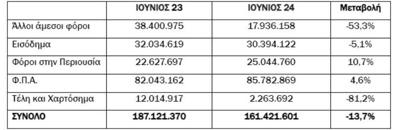 Για το μήνα αναφοράς (Ιούνιος) οι συνολικές εισπράξεις έναντι νέου ληξιπρόθεσμου (εκτός 10 ΜΦΚ) έφτασαν τα 173 εκ. €, ενώ την αντίστοιχη περίοδο του 2023 έφτασαν τα 199 εκ. € (μείωση κατά 13%).
