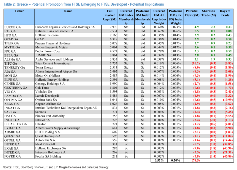 Αν προαχθεί η χώρα σε καθεστώς «αναπτυγμένης αγοράς», 29 εταιρείες θα είναι επιλέξιμες για ένταξη στον δείκτη FTSE Developed Market, έναντι 33 εταιρειών που συμμετέχουν τώρα στον δείκτη των αναδυόμενων αγορών. Οι 9 εταιρείες θα συμμετέχουν στον δείκτη FTSE Developed Market Standard και οι 20 εταιρείες στον δείκτη FTSE Developed Market Small Cap. Στην τρέχουσα μορφή του δείκτη, η διάρθρωση είναι αντίθετη με 29 συμμετοχές στον μεγάλο Standard δείκτη και 4 στον μικρό δείκτη Small Cap. Η ομάδα της JPM εκτιμά ότι θα υπάρξει εκροή 1,83 δισ. δολάρια από τον δείκτη FTSE EM από τους παθητικούς διαχειριστές (index trackers) και εισροή από παθητικούς διαχειριστές 1,75 δισ. δολαρίων από τον δείκτη FTSE DM (index trackers) με καθαρή εκροή περίπου 75 εκατ. δολαρίων στις μετοχές.