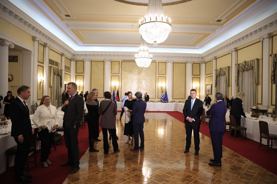 Η κυρία Σακελλαροπούλου, απευθυνόμενη στον Γερμανό Πρόεδρο και την σύζυγό του, σημείωσε ότι η επίσκεψή τους αποτελεί επιστέγασμα των στενών δεσμών φιλίας που συνδέουν τους δύο λαούς, καθώς και της εποικοδομητικής συνεργασίας μας σε όλους τους τομείς και πρόσθεσε ότι τους υποδέχεται με ιδιαίτερη χαρά στην Αθήνα, σε ανταπόδοση της επίσκεψής της στο Βερολίνο, πριν από δύο χρόνια, από την οποία διατηρεί άριστες αναμνήσεις. Παρών στο Προεδρικό Μέγαρο ήταν και ο πρώην προπονητής της εθνικής ομάδας ποδοσφαίρου που κατέκτησε το «Euro 2004» Ότο Ρεχάγκελ.