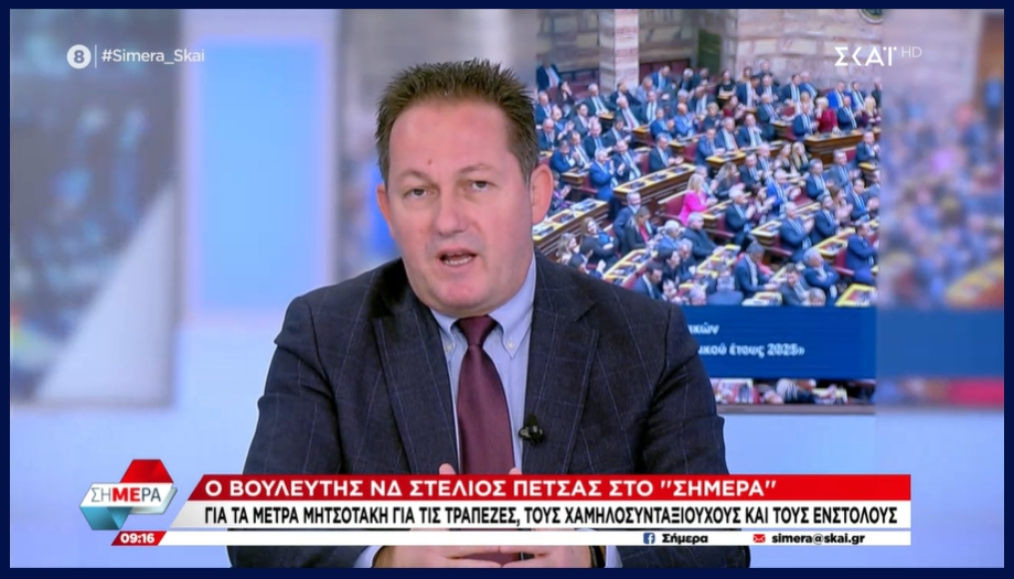 Σε συνέντευξη που παραχώρησε στο τηλεοπτικό σταθμό Σκάι, ο βουλευτής της Νέας Δημοκρατίας κ. Στέλιος Πέτσας, αναφέρθηκε στη χθεσινή παρέμβαση του πρωθυπουργού για τις τράπεζες, τους χαμηλοσυνταξιούχους και τους ενστόλους.
