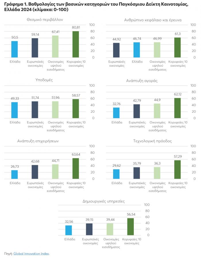 Σύμφωνα με τα πορίσματα της μελέτης, το 2024, η Ελλάδα κατέλαβε την 45η θέση στον Παγκόσμιο Δείκτη Καινοτομίας και την 25η θέση στον Δείκτη Ψηφιακής Οικονομίας και Κοινωνίας (DESI) της ΕΕ, με σημαντικές αποκλίσεις από τον ευρωπαϊκό μέσο όρο σε αρκετές υποκατηγορίες.