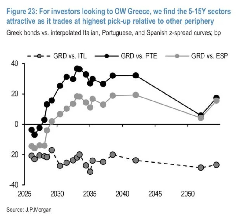 Για τους επενδυτές που θέλουν να ανοίξουν overweight θέσεις στην Ελλάδα στο πλαίσιο ενός μεσοπρόθεσμου carry trade, η JP Morgan χαρακτηρίζει πιο ελκυστικές τις διάρκειες 5-15 χρόνων.