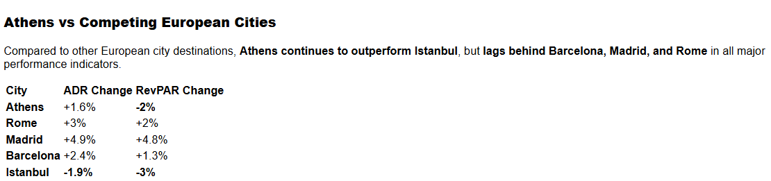 Compared to other European city destinations, Athens continues to outperform Istanbul, but lags behind Barcelona, Madrid, and Rome in all major performance indicators.
