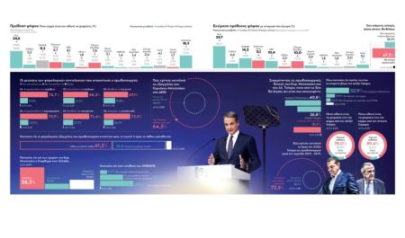 Συγκεκριμένα, το 32,9% του συνόλου κρίνει θετικά και μάλλον θετικά τις πρωθυπουργικές εξαγγελίες, ενώ το 35,4% πιστεύει ότι οι φορολογικές μεταρρυθμίσεις που παρουσίασε ο Κ. Μητσοτάκης κινούνται προς τη σωστή κατεύθυνση. Η μεγάλη πλειοψηφία, βέβαια, συνεχίζει να τοποθετείται αρνητικά απέναντι στο πακέτο των εξαγγελιών, ωστόσο το ποσοστό που κρίνει θετικά τα φορολογικά μέτρα μπορεί ναθεωρηθεί μια καλή επίδοση για το κυβερνητικό στρατόπεδο. Σχετικά με την πρόθεση και την εκτίμηση ψήφου η Νέα Δημοκρατία φαίνεται να κερδίζει από τον αντίκτυπο των θετικών μέτρων, αλλά περιορισμένα. Ειδικότερα η καταγραφή των δυνάμεων των κομμάτων στην πρόθεση και εκτίμηση ψήφου σύμφωνα με την έρευνα της GPO έχει ως εξής: