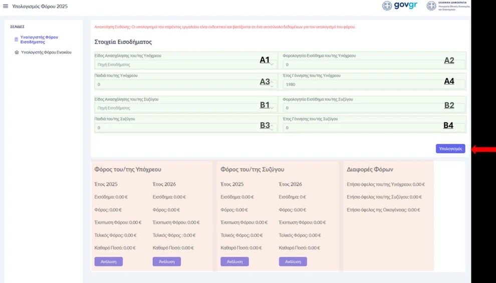 Οι φορολογούμενοι πρέπει να εισάγουν το μηνιαίο μίσθωμα και να πατήσουν το κουμπί «Υπολογισμός». Η εφαρμογή υπολογίζει το ετήσιο μίσθωμα, τον φόρο για το έτος 2025, τον φόρο για το έτος 2026, τη διαφορά που προκύπτει καθώς και την ποσοστιαία μείωση του φόρου.