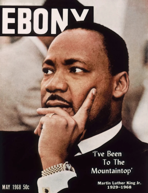 Το Ebony, που ιδρύθηκε το 1945 από τον Τζον Χ. Τζόνσον, έγινε το πιο δημοφιλές περιοδικό για τους Αφροαμερικανούς, δίνοντας φωνή σε μια κοινότητα που τα μεγάλα έντυπα συχνά αγνοούσαν. Μετά τη δολοφονία του Μάρτιν Λούθερ Κινγκ στις 4 Απριλίου 1968, ενώ τα Time και Life τον τίμησαν ελάχιστα και το Atlantic σχεδόν καθόλου, το Ebony αφιέρωσε το εξώφυλλό του σε μια λιτή φωτογραφία του, με το χέρι στο πηγούνι. Η εικόνα ήταν του Μονέτα Σλιτ Τζούνιορ, φωτογράφου που η Κορέτα Σκοτ Κινγκ ζήτησε να καλύψει την κηδεία· η δική του συγκλονιστική φωτογραφία της χήρας με την κόρη τους τού χάρισε Πούλιτζερ. Το τεύχος του Μαΐου συμπεριέλαβε δύο αφιερώματα και τα τελευταία λόγια από την ομιλία «I’ve Been to the Mountaintop», μετατρέποντας το περιοδικό σε χώρο συλλογικού πένθους και μνήμης.