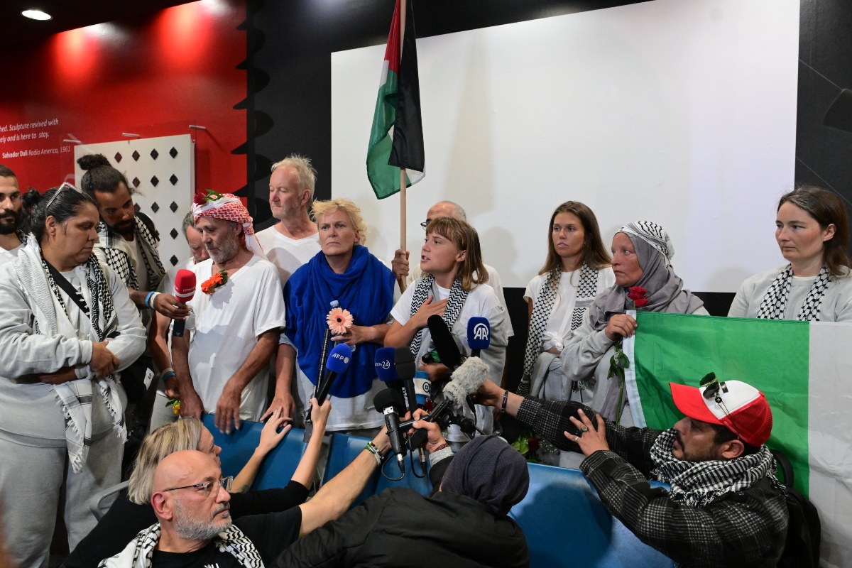 Στο αεροδρόμιο επικράτησε συγκινητική ατμόσφαιρα, με εκατοντάδες πολίτες να συγκεντρώνονται για να υποδεχτούν την Τούνμπεργκ και τους υπόλοιπους ακτιβιστές. Πολλοί κρατούσαν παλαιστινιακές σημαίες, λουλούδια και πανό με συνθήματα αλληλεγγύης προς τον λαό της Παλαιστίνης. Οι αφιχθέντες έγιναν δεκτοί με χειροκροτήματα, φωνές και δάκρυα συγκίνησης, ενώ δεν έλειψαν οι στιγμές έντονου ενθουσιασμού όταν η Τούνμπεργκ χαιρέτησε το πλήθος και φώναξε «Ελευθερία στην Παλαιστίνη!».