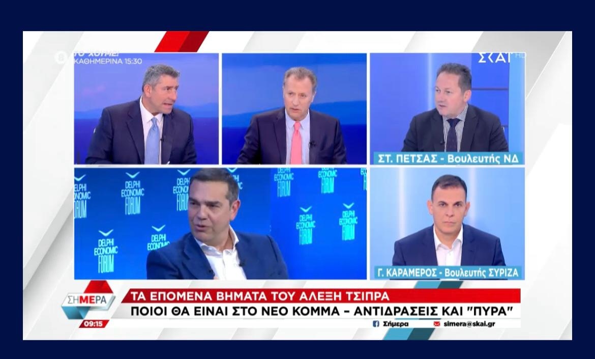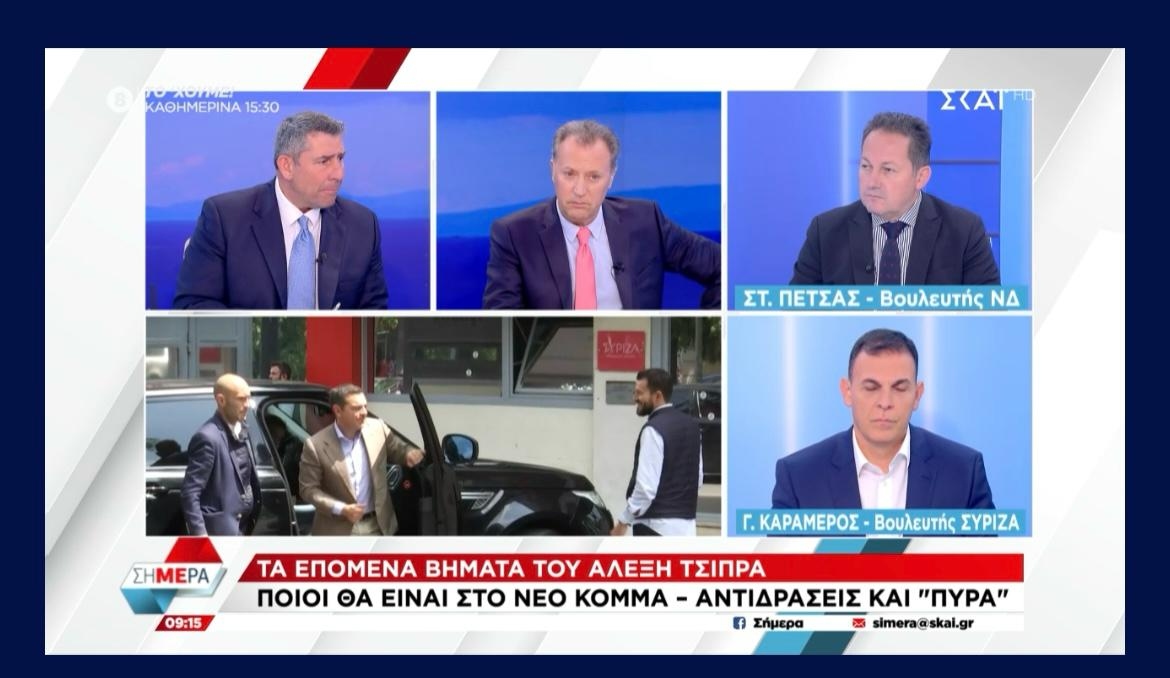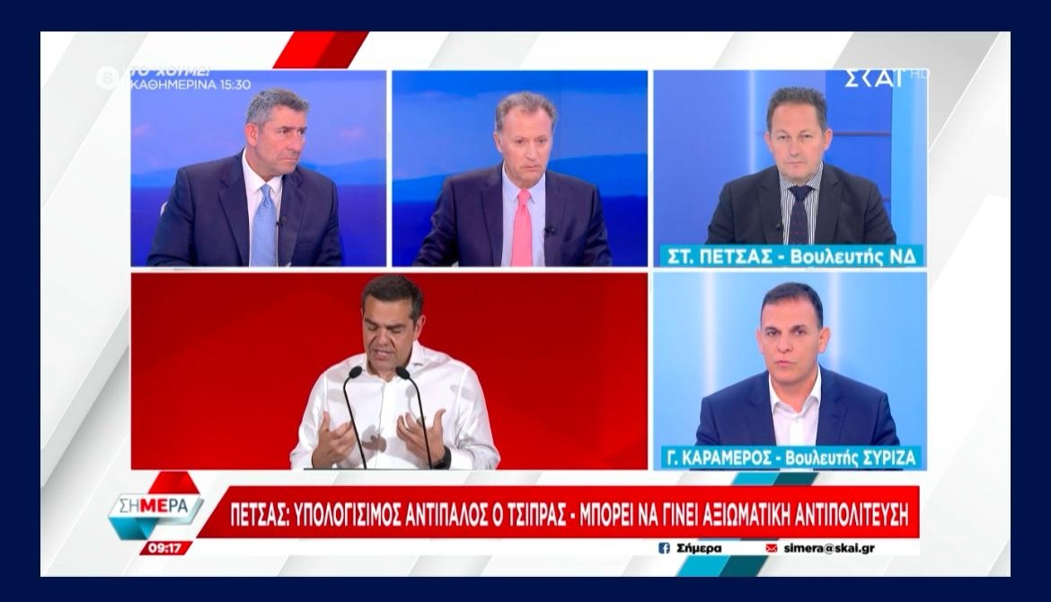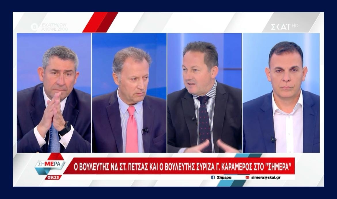 Μία άκρως πολιτική σύγκρουση μεταξύ του κυβερνητικού βουλευτή Στέλιου Πέτσα και του βουλευτή Ανατολικής Αττικής Γιώργου Καραμέρου καταγράφηκε το πρωί της Τρίτης στον τηλεοπτικό σταθμό ΣΚΑΪ TV, σε μια συζήτηση που ξεκίνησε από τη νέα πρωτοβουλία Τσίπρα και γρήγορα επεκτάθηκε σε θέματα ασφάλειας, θεσμικότητας, διαφάνειας και κοινωνικής δυσαρέσκειας.