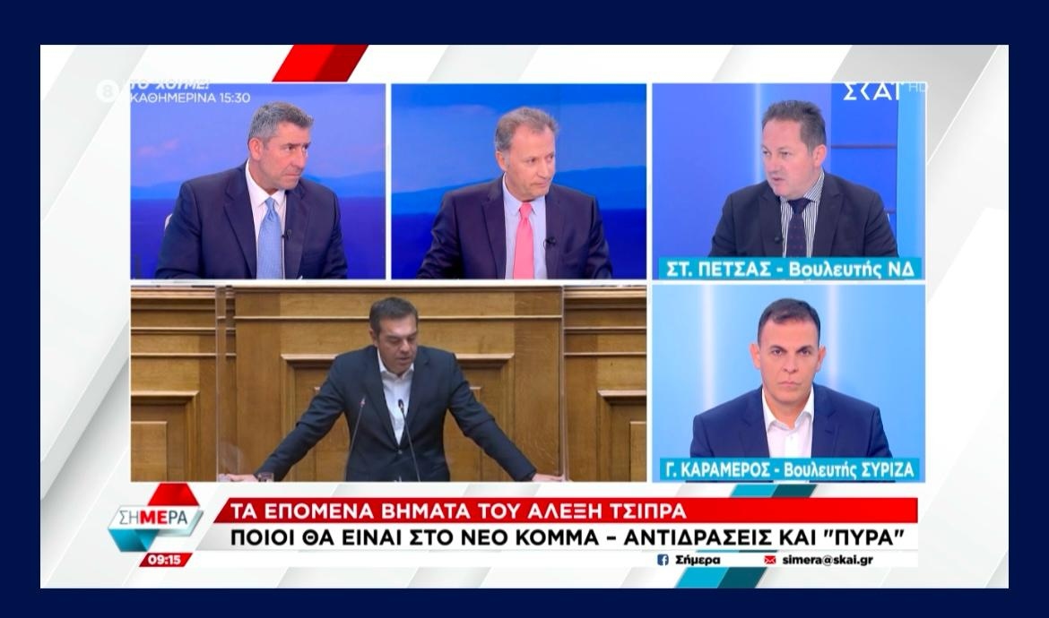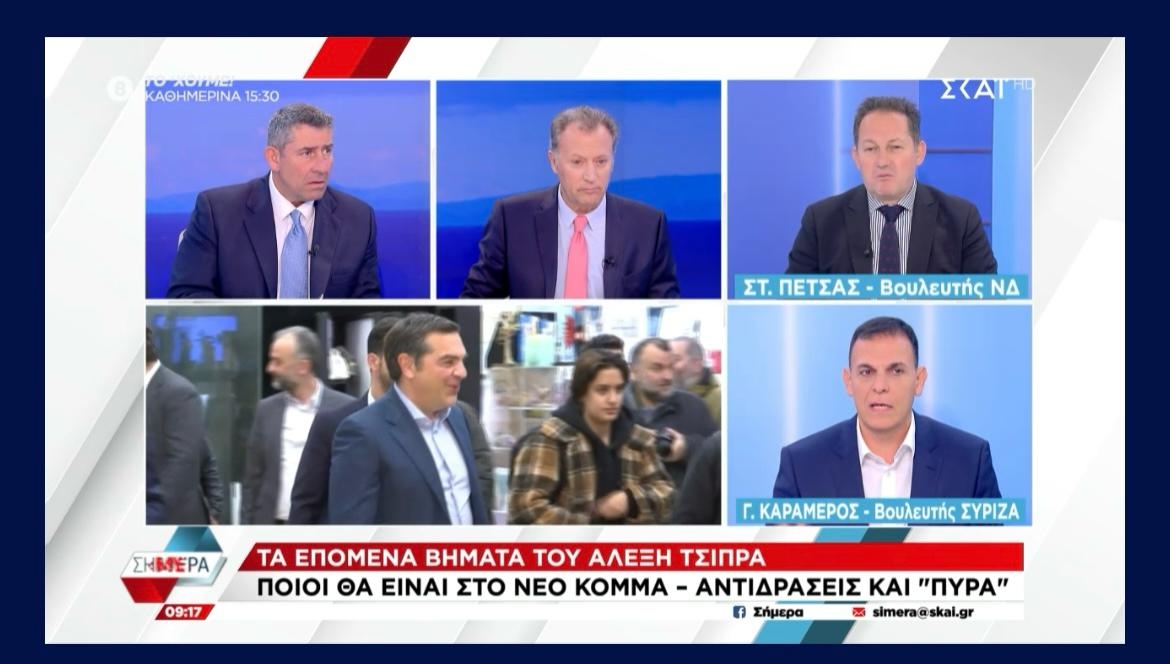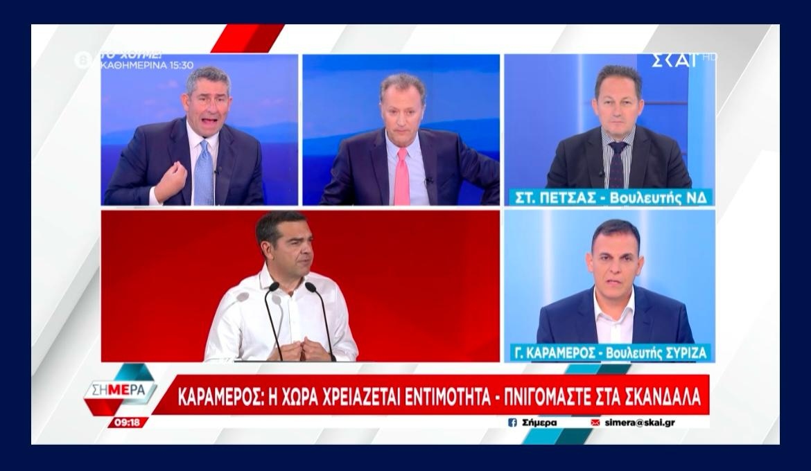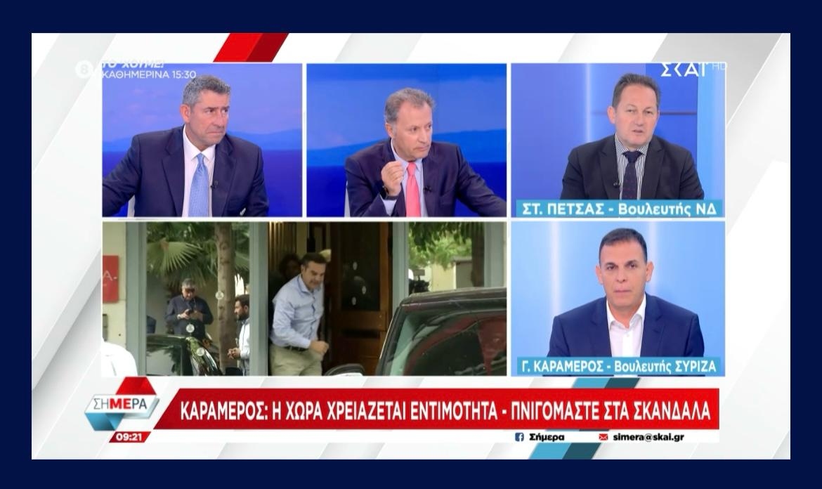 Μία άκρως πολιτική σύγκρουση μεταξύ του κυβερνητικού βουλευτή Στέλιου Πέτσα και του βουλευτή Ανατολικής Αττικής Γιώργου Καραμέρου καταγράφηκε το πρωί της Τρίτης στον τηλεοπτικό σταθμό ΣΚΑΪ TV, σε μια συζήτηση που ξεκίνησε από τη νέα πρωτοβουλία Τσίπρα και γρήγορα επεκτάθηκε σε θέματα ασφάλειας, θεσμικότητας, διαφάνειας και κοινωνικής δυσαρέσκειας.