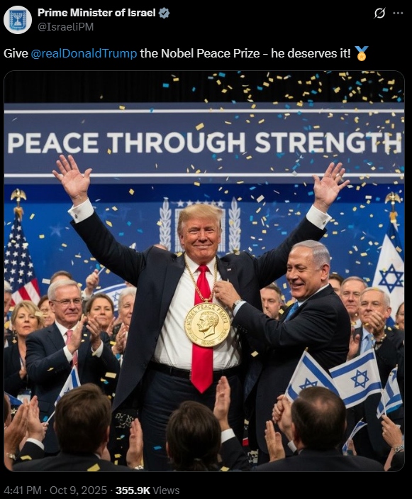«Δώστε το Νόμπελ Ειρήνης στον Τραμπ», έγραψε ο Μπενιαμίν Νετανιάχου σε νέα ανάρτησή του στο X (πρώην Twitter), συνοδεύοντάς τη με μια εικόνα που δημιουργήθηκε μέσω Τεχνητής Νοημοσύνης.