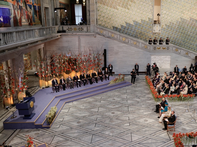 Ο πρόεδρος της νορβηγικής επιτροπής, Γιέργκεν Βάτνε Φρίντνες, ανέβηκε στο βήμα και μίλησε με σαφήνεια για «την ανάγκη να υπερασπιστούμε τη δημοκρατία σε μια εποχή που αυτή κινδυνεύει από τον αυταρχισμό». Το μήνυμά του ήχησε σαν προειδοποιητικό καμπανάκι σε έναν κόσμο όπου τα δημοκρατικά θεμέλια τρίζουν — από τη Βενεζουέλα έως τις ίδιες τις Ηνωμένες Πολιτείες.
