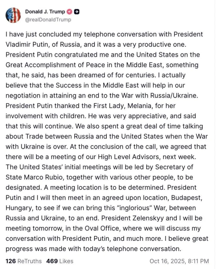 «Την ερχόμενη εβδομάδα, θα διεξαχθούν συνομιλίες σε επίπεδο υψηλόβαθμων αντιπροσωπειών. Της αμερικανικής θα ηγείται ο υπουργός Εξωτερικών Μάρκο Ρούμπιο και μένει να διευκρινιστεί ο τόπος της συνάντησης. Στη συνέχεια θα συναντηθώ με τον Βλάντιμιρ Πούτιν στη Βουδαπέστη, όπως συμφωνήσαμε, για να δούμε αν μπορούμε να δώσουμε τέλος στον άδοξο πόλεμο. Αύριο, που θα συναντηθούμε με τον Ουκρανό πρόεδρο στο Οβάλ Γραφείο θα συζητήσουμε το περιεχόμενο τις συνομιλίας μου με τον πρόεδρο της Ρωσίας και πολλά ακόμη θέματα.»