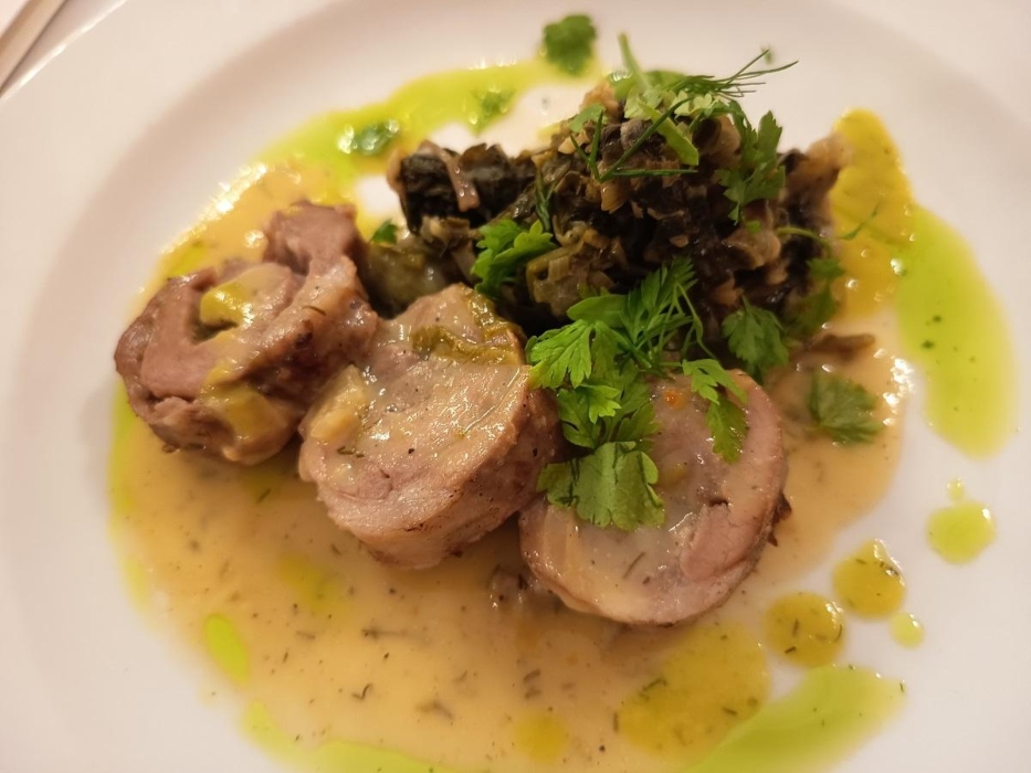 Και πάμε στα κυρίως, με ρεβιθάδα (Νάξου) στον ξυλόφουρνο συνοδευόμενη από μαγιάτικο ξηράς ωρίμανσης, τρίμμα αυγοτάραχου, βότανα και μαραθόσπορο. Κι ακόμα, κατσίκι φρικασέ, με πράσινα χόρτα εποχής και ελαφρύ αυγολέμονο.