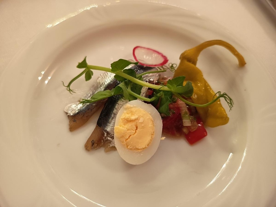 Στα πρώτα και η σαρδέλα στο αλάτι, με αυγό ορτυκιού, καυτερή πιπεριά και ντοματίνια.